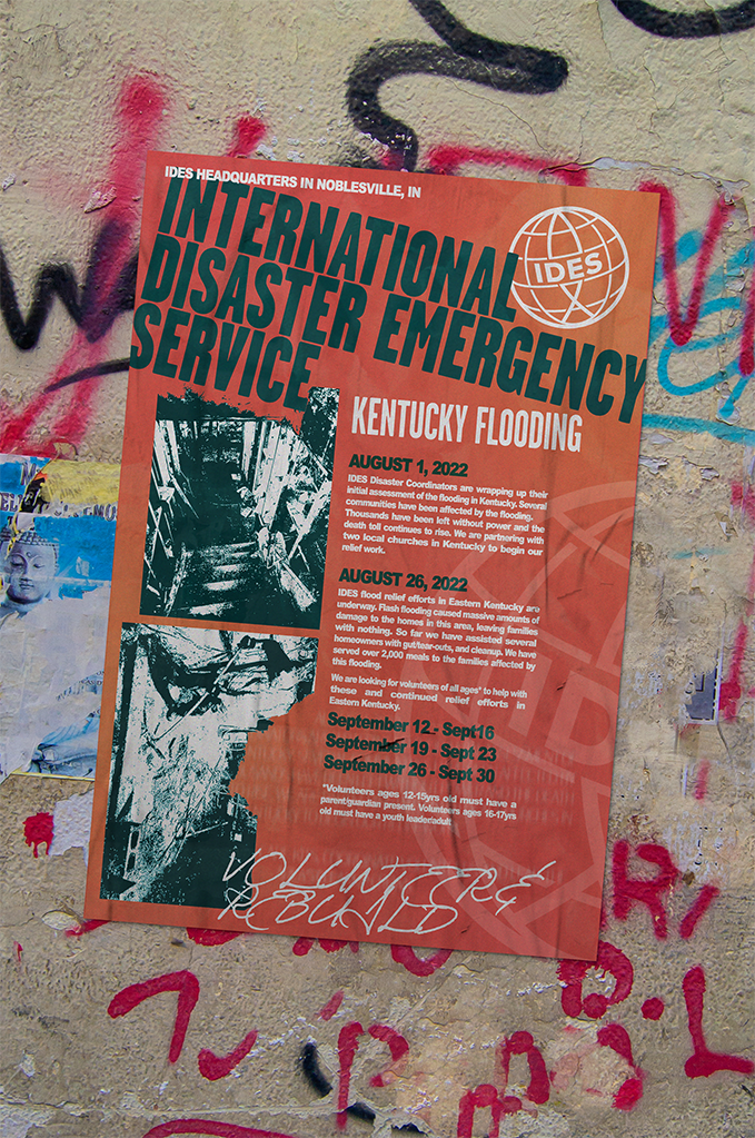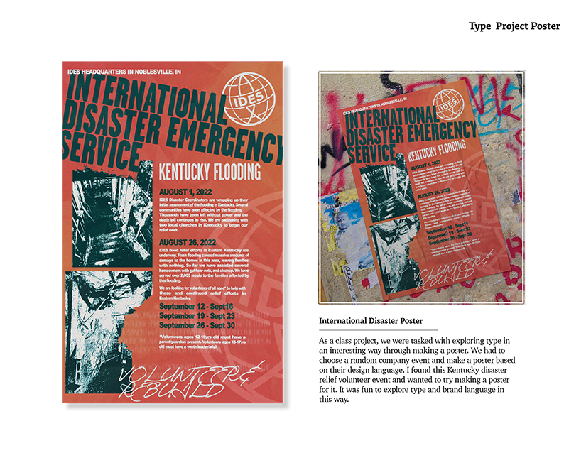 As a class project, we were tasked with exploring type in an interesting way through making a poster. We had to choose a random company event and make a poster based on their design language. I found this Kentucky disaster relief volunteer event and wanted to try making a poster for it. It was fun to explore type and brand language in this way.